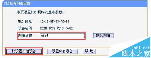 4、在電力貓的管理頁面中,依次點(diǎn)擊PLC設(shè)置 >> PLC私有網(wǎng)絡(luò)設(shè)置,在這里輸入剛剛設(shè)置好的網(wǎng)絡(luò)名稱,然后點(diǎn)擊“僅設(shè)置本地設(shè)備”按鈕