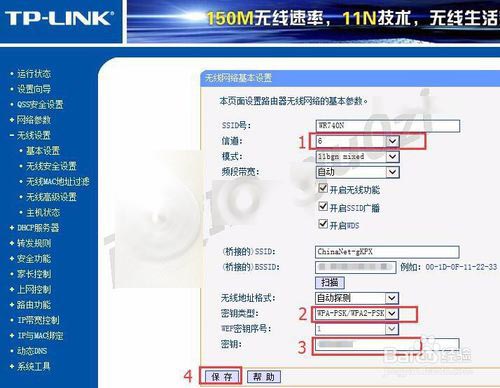6、點擊連接后,要橋接的光貓信息如SSID/BSSID都會自動填寫上.此處要特別注意的是,上方的信道和下面的密鑰類型要設置得跟光貓的是一樣的,然后輸入相應密碼,并保存.