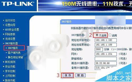 8、經過以上的設置,基本上的操作就完成了,但是為了方便使用,還需要對DHCP服務器進行設置,關閉DHCP功能.我們的目標是把無線路由器變成AP,對網絡管理的主動權還是交給光貓,而不需要用無線路由器來進行IP的分配.
