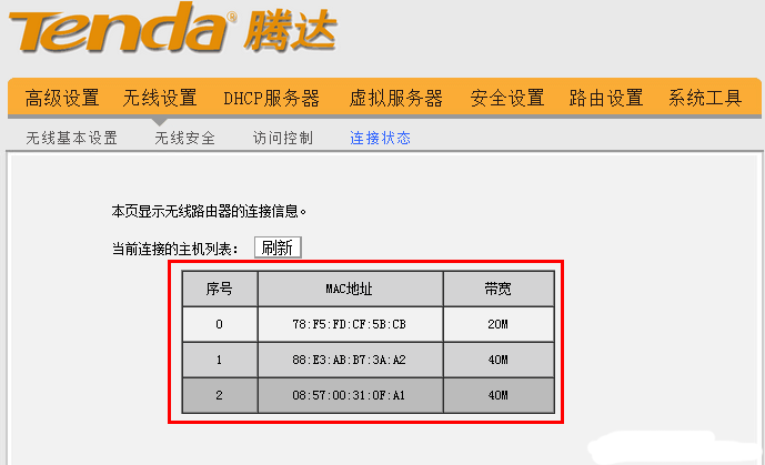 點擊“無線設(shè)置”——>“連接狀態(tài)”,查看“當(dāng)前連接的主機列表”,如下圖所示。