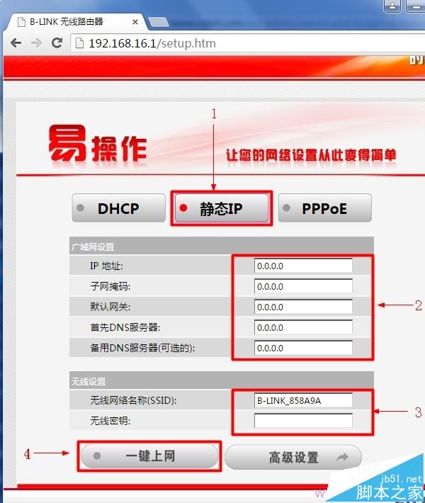 (3)、靜態IP:如果辦理寬帶業務后,寬帶運營商提供了IP地址、子網掩碼、網關、DNS地址給用戶;在未使用路由器的時候,需要在電腦的本地連接中,填寫寬帶運營商提供的IP地址、子網掩碼、網關、DNS地址,然后電腦才能夠上網。如果你辦理的寬帶是這種情況,那么在設置B-Link路由器時,就應該選擇:靜態IP,詳細設置方法如下所示