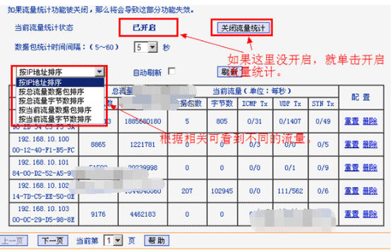 第4步:開(kāi)啟流量統(tǒng)計(jì)之后,單擊配置列下的刪,把所有的都刪掉,然后就可以看到最新局域網(wǎng)內(nèi)所有使用這個(gè)路由器的電腦流量使用情況了,通過(guò)一些排序我們就可以看到具體是那個(gè)ip使用的流量最大,如果他使用最大的話(huà),及有可能就是正在下載一些大文件或是看視頻了。