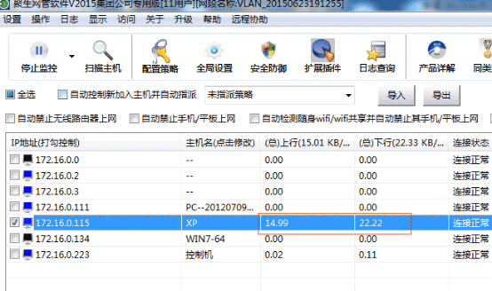 目前國(guó)內(nèi)類(lèi)似的局域網(wǎng)網(wǎng)速控制軟件很多,例如有一款“聚生網(wǎng)管”(下載地址:http://www.grabsun.com/wangguan.html),只需要在公司局域網(wǎng)一臺(tái)電腦安裝之后,就可以?huà)呙璧骄钟蚓W(wǎng)內(nèi)所有上網(wǎng)的設(shè)備,可以實(shí)時(shí)查看各個(gè)電腦帶寬占用情況,并可以實(shí)時(shí)控制各個(gè)電腦網(wǎng)速,對(duì)于手機(jī)、平板電腦等同樣可以和電腦一樣進(jìn)行控制。如下圖所示: