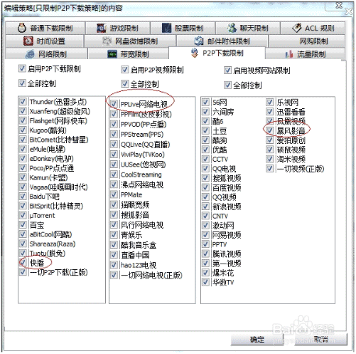 此外,局域網(wǎng)網(wǎng)速慢的一個(gè)很重要的原因是有人進(jìn)行P2P下載、看P2P網(wǎng)絡(luò)電視以及在線看視頻,因此,通過(guò)聚生網(wǎng)管軟件還可以限制局域網(wǎng)P2P下載、禁止看網(wǎng)絡(luò)電視、屏蔽視頻網(wǎng)站等,防止此類(lèi)與工作無(wú)關(guān)的上網(wǎng)行為對(duì)局域網(wǎng)網(wǎng)速的搶占。如下圖所示: