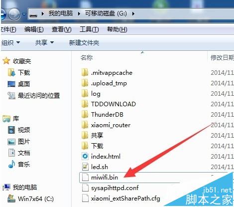 3、接下來(lái)將下載好的小米路由器ROM包復(fù)制到U盤(pán)根目錄下,并命名為“miwifi.bin”。在此需要說(shuō)明一點(diǎn),U盤(pán)文件系統(tǒng)格式必須為“Fat”或“Fat32”。