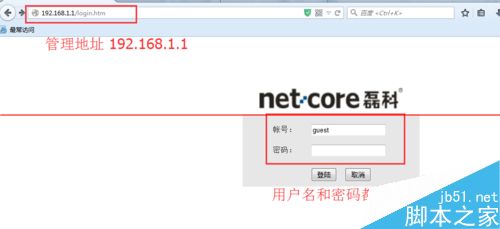 2、在瀏覽器中輸入192.168.1.1進入管理界面,默認用戶名和密碼是guest