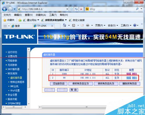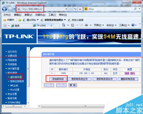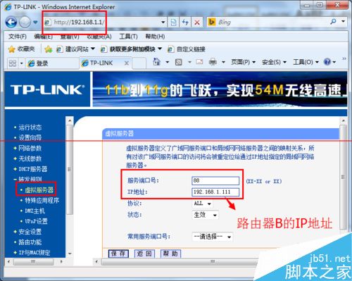 6、進入路由器A進行端口映射,點擊“轉發規則”-“虛擬服務器”-“添加新條目”,增加ip地址為路由器B的端口映射: