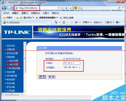 3、上圖中第二層為路由器B,本例中也是采用的TPLINK無線路由為例,用來連接內網其他電腦。(由于都是TPLINK無線路由,后臺管理界面默認都是192.168.1.1,所以首先我對路由器B進行了LAN口IP設置,設置成了192.168.0.1,使得路由器B的管理界面通過http://192.168.0.1登錄,以此來區分路由器A和路由器B,當然你也可以先不進行設置通過http://192.168.1.1進入后臺,直接連接路由器B進行如下設置,設置后再連接路由器A和路由器B的網線即可。)登錄路由器B的后臺后,點擊“網絡參數”-“LAN口設置”設置LAN口設置 IP地址為 171.16.1.1: