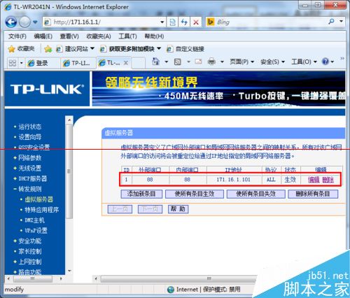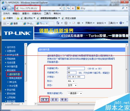 7、進入路由器B的后臺,點擊“轉發規則”-“虛擬服務器”-“添加新條目”,假設T+服務器ip地址為171.16.1.101,則增加對應服務器ip地址的端口映射: