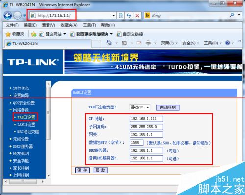 4、保存后路由器會提示需要重新啟動,重新啟動后,路由器B的后臺管理登錄地址為:http://171.16.1.1,登錄后臺后,點擊“網絡參數”-“WAN口設置”設置wan口IP地址為192.168.1.111(注:由于路由器B連接的是路由器A的LAN口,所以我們只要把路由器B當成一臺電腦即可,設置WAN口IP為路由器A下局域網電腦的IP地址,此處的192.168.1.111只是一個例子,實際上可以為任意非占用的192.168.1.XXX;而網則和路由器A下的其他PC一樣,設置為192.168.1.1即可),網關為192.168.1.1: