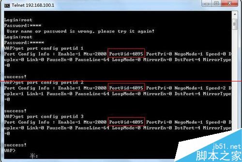 7、登陸成功顯示提示符WAP〉,WAP后輸入:get port config portid 1,回車得到端口1的值,如此得到2.3.4的值。