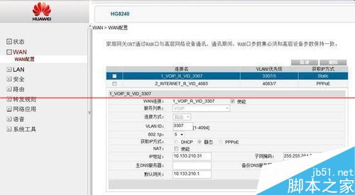 11、選樹狀列表的第二項WAN,點下面的WAN配置。新建WAN連接:使能前面的復選框勾上 服務列表:選“INTERNET”連接方式:路由VLAN ID,前面查的(我用的1端口的portvid值)802.1p,前面查的(我用的1端口的portpri值)獲取IP方式:PPPoENAT,使能復選框勾上