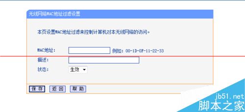 4、點擊”添加新條目“,在無線網絡MAC地址過濾設置,添加需要要限制的MAC地址,描述隨便設置一下即可!