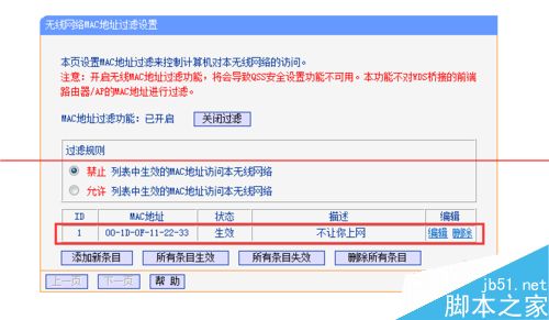 3、點擊“啟用過濾”,過濾規則選擇為“禁止 列表中生效的MAC地址訪問本無線網絡”!