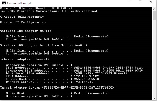 在包括Windows在內的系統中,均支持在終端上運行“ipconfig”命令。(當然,如果有耐心的話,你也可以只通過鼠標,一步步地點擊到網絡連接中查看當前參數)。