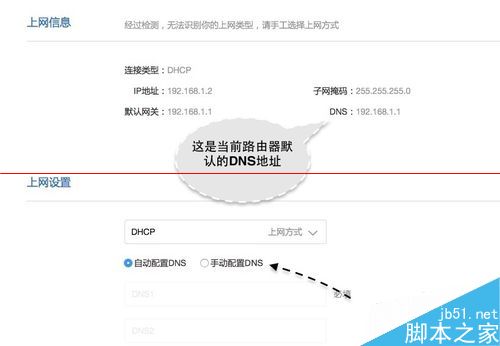 4、如下圖所示,在這里我們可以看到當前小米路由器的 IP 信息,默認是用 192.168.31.1 來作為 DNS 地址的,也就是小米路由器自身的地址。如果想要手動設置的話,請點擊“上網設置”欄目下的“手動配置DNS”選項。