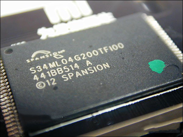 SPANSION 飛索半導體的NAND閃存,型號是S34ML04G200TFI00,容量512MB 。這片閃存中保存了系統程序。老款小米路由使用的是SPI接口的閃存,容量為16MB。此前,《假裝是極客》(微信號:geeker_ding)在路由器上遇到的系統閃存最高容量為32MB。使用大容量NAND閃存后有兩個好處,一是相比SPI接口而言,NAND閃存的速度更快,這樣系統的啟動速度和程序相應速度會更快;二是使用大容量的閃存后,可以直接在系統中增加更多的功能、安裝更多的程序,而不用將核心的數據放到外置存儲中。