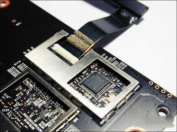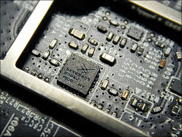 另一個屏蔽罩下面是華碩旗下祥碩科技的ASM1060芯片。這款芯片是PCIE X1轉SATA控制器,支持速度最高6Gbps。同時,引出了SATA接口。通過PCIE接口擴展SATA后可以保證更高的數據傳輸速度,比通過USB接口效率更高、更穩定。