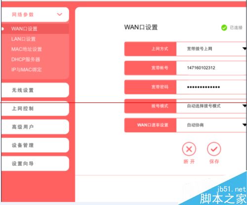 2、登陸后,請(qǐng)找到WAN設(shè)置選項(xiàng),如果你的路由器是主路由器,請(qǐng)?jiān)谏暇W(wǎng)方式中選擇寬帶撥號(hào)上網(wǎng),然后輸密碼,模式選擇自動(dòng)撥號(hào)模式,最后點(diǎn)保存,如果你是在路由器后面再連接路由器,請(qǐng)?jiān)谏暇W(wǎng)方式中選擇自動(dòng)獲取IP地址,有的路由器稱動(dòng)態(tài)IP,反正千篇一律,