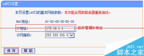 登錄路由器管理界面,點擊 網絡參數 >> LAN口設置,將LAN口IP修改為與前端不在同一網段(如前端為192.168.1.1,則修改為172.16.1.1),點擊 保存,確定重啟。