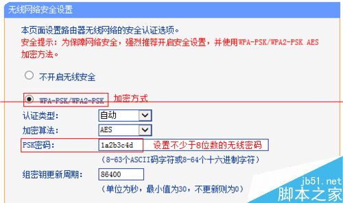 點擊 無線設置 >> 無線安全設置,選擇 WPA-PSK/WPA2-PSK 的加密方式,在 PSK密碼 的位置設置無線密碼,點擊 保存。