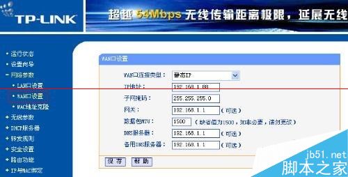 3、設置完成后,打開IE,在地址欄輸入172.16.1.1,重新進入無線路由器WR541G設置界面,設置無線路由器的WAN口,在WAN口聯接類型中選擇靜態IP,將其設置為:IP地址192.168.1.X (X取自然數范圍2—254)子網掩碼255.255.255.0 默認網關192.168.1.1 。注意IP地址192.168.1.X,其中X,一定要是在局域網中沒有用過IP地址,否則會造成沖突。