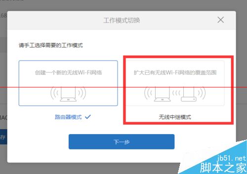 5、然后就可以手工選擇路由器的工作模式,中級模式可以擴大無線WIFI網絡的覆蓋范圍,點擊“無線中級模式”,然后點“下一步”就可以選擇切換;