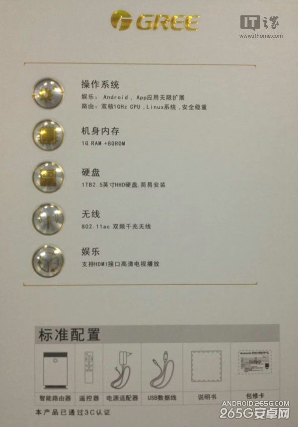 沒錯(cuò),這里的新動(dòng)作就是指曝光的格力路由器,它搭載Android系統(tǒng)、支持APP應(yīng)用擴(kuò)展,自帶1GB內(nèi)存+8GB存儲(chǔ)空間,內(nèi)置1TB 2.5英寸硬盤,支持802.11ac雙頻千兆無(wú)線,提供HDMI接口,自帶遙控器。