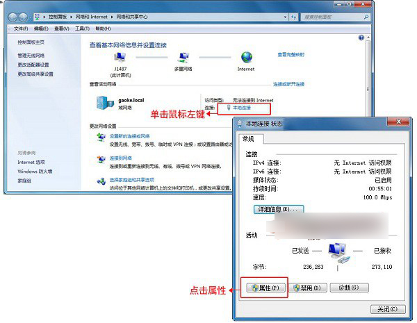 2、鼠標左鍵單擊“本地連接”然后點擊“屬性”,如下圖所示。