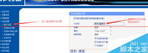 6、然后進入路由器無線設置,把亂碼復制進SSID號,保存