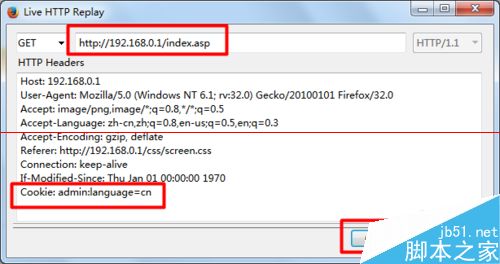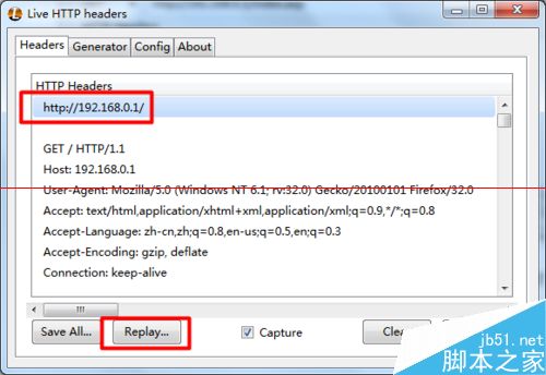 6、待安裝并重啟瀏覽器后,運行組件“Live HTTP”工具,并在瀏覽器地址欄輸入路由器地址并訪問,此時將在LIVE HTTP界面顯示如圖所示的信息,選中其中的某一條信息,點擊“Replay”按鈕。