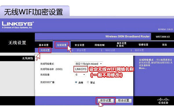 第三步:保存完上步的基本設置后,再點擊導航條上的“無線設置”,然后在無線Wifi加密設置中,設定一個Wifi無線網絡名稱,這個名稱可以默認,也可以修改成自己喜歡的名稱,如m.survivalescaperooms.com,設定名字好,以后用手機登無線設備,就可以搜索到這個名稱的WiFi無線網絡,設置Wifi名稱后,點擊底部的“保存設置”,如圖所示。