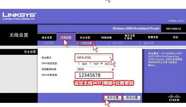 第四步:然后再點擊頂部導航條無線設置下面的“安全設置”這里主要是設置Wifi無線密碼,為了防止被周邊用戶蹭網,無線密碼最好設置為復雜一些。在這步設置中,最好將安全模式設置為WPA-PSK2,WPA共享秘鑰也就是Wifi無線密碼,默認是12345678,為了防止被蹭網,影響網速和安全,強烈建議大家將這個密碼設置為復雜一些,比如m.VeVB.COm@loveyou,這樣強度的密碼,就可以防止被蹭網了。設置完了,同樣不要忘記了點擊底部的“保存設置”。