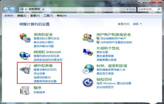2、然后找到“硬件和聲音”,點擊打開。