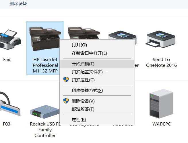 2、選擇連接好電腦的打印機(jī),把掃描文件放置好打印機(jī)后,右鍵打印機(jī),選擇開始掃描;