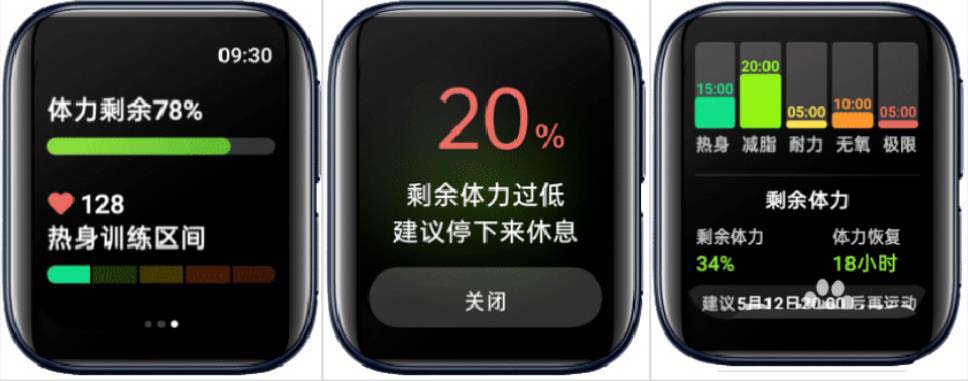 2、運(yùn)動(dòng)中OPPO Watch實(shí)時(shí)監(jiān)測你的體力,過低時(shí)會(huì)主動(dòng)提醒你!