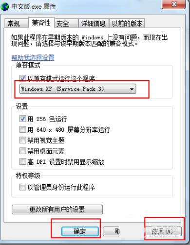 7、選擇windows xp service pack3 兼容模式,點擊應用,最后確定即可。