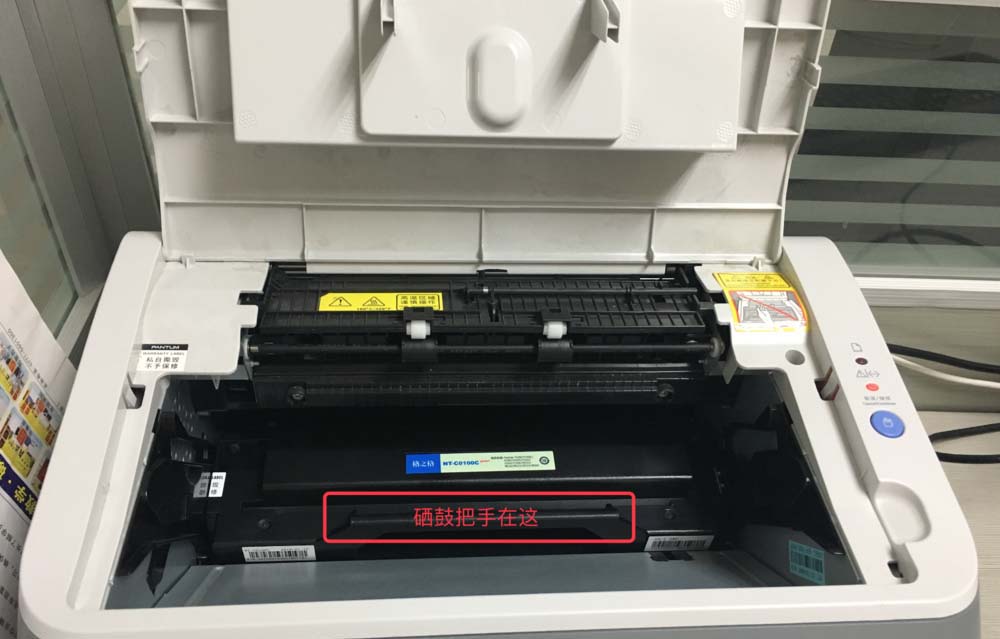 4、抓住把手,拿出打印機中的硒鼓,如下圖: