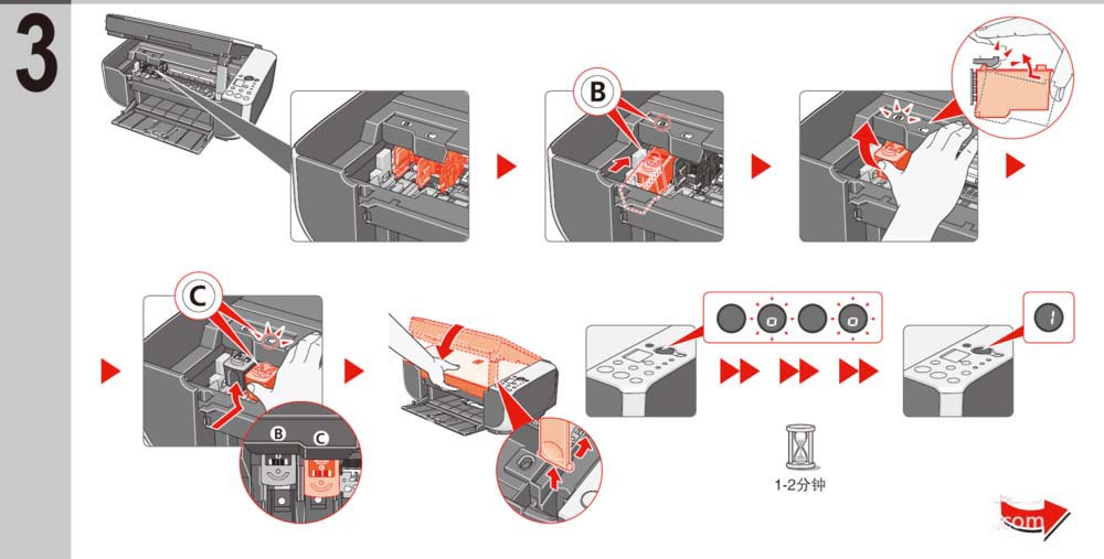 2、一個B盒一個C盒把用完的拿出來把新的放進去,這個時候要等待20秒讓機器自檢完成打印頭會回歸較正位0