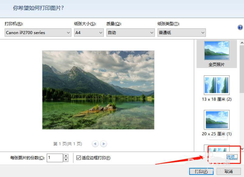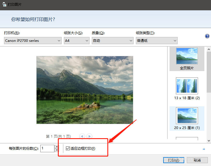 2、打開打印功能后,彈出打印圖片設置界面;默認是已勾選適應邊框打印;