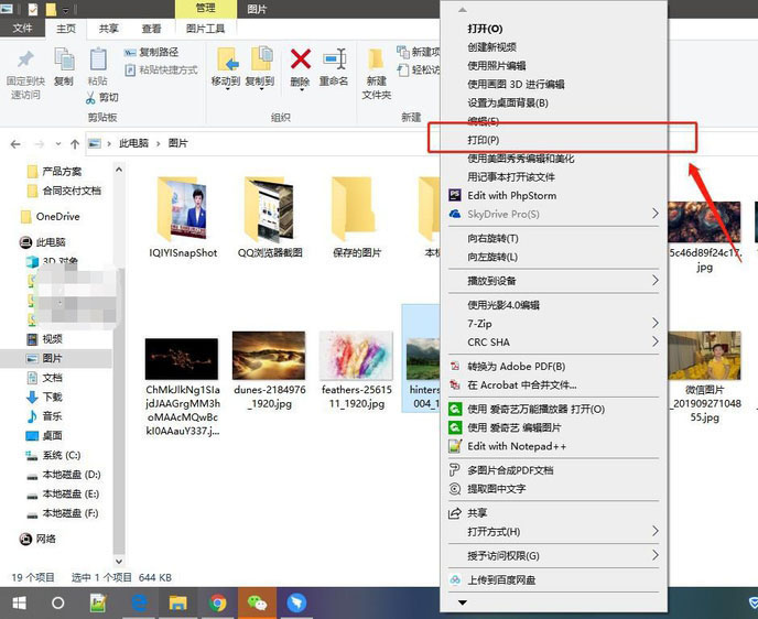 1、選中一張待打印的圖片,右鍵,彈出菜單選擇打印功能,點擊進入;
