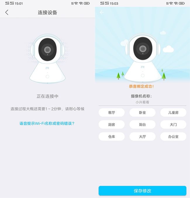 掃描說明書上的二維碼下載“中興智能管家”APP,用包裝里的充電器和數據線為小興看看充電,然后點擊“+”號添加智能設備,此時掃描機身底部的二維碼,設置網絡,需要注意的是,小興看看不支持5G網絡,所以只能連接2.4G網絡。接著在彈出的二維碼中用攝像頭進行掃描即可。