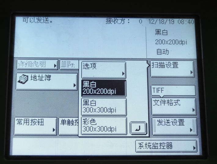 8、可以對掃描(發送)進行系統設置。 一般選擇300X300 dpi,較為清晰。 之后回到發送操作主界面。