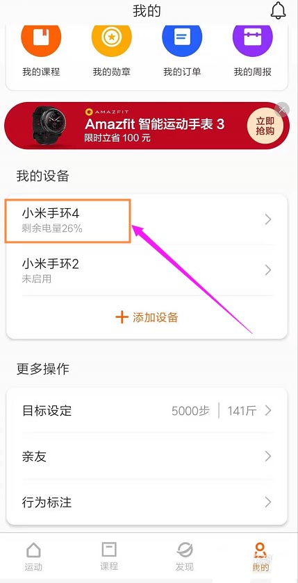 3、在我的界面中,點擊【小米手環(huán)4】,進入到手環(huán)設置中。