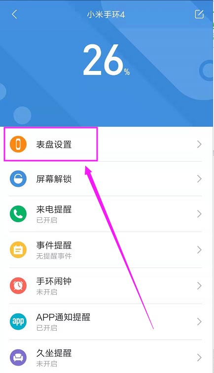 ②點擊【小米手環(huán)4】,進入到手環(huán)設置中,點擊【表盤設置】。