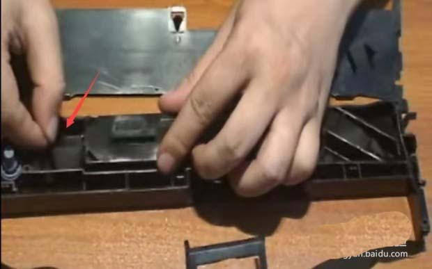 8、然后把先取出的色帶驅動軸放回原來的位置,使新裝的色帶從兩個齒輪中間通過;