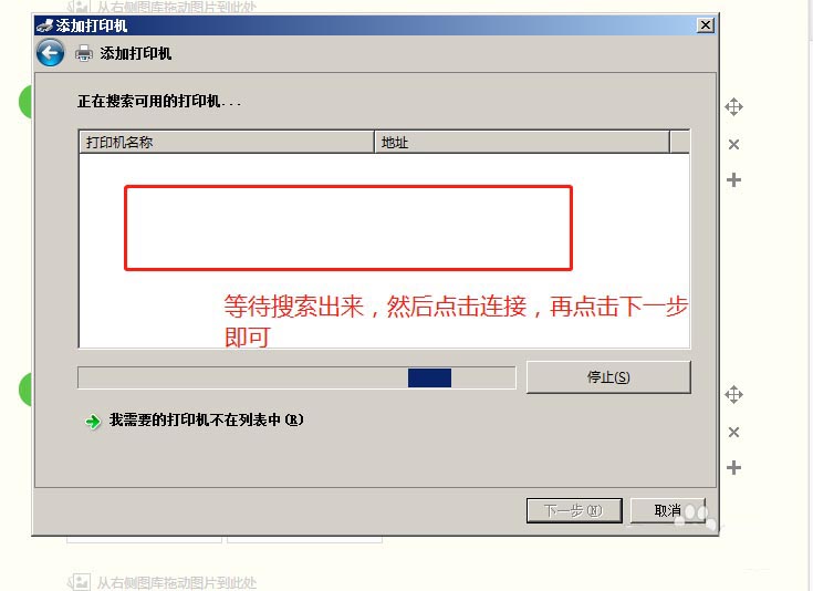 6、等待搜索打印機,搜索出來以后,選擇后,點擊下一步,等待安裝打印機驅(qū)動,安裝完成即可。