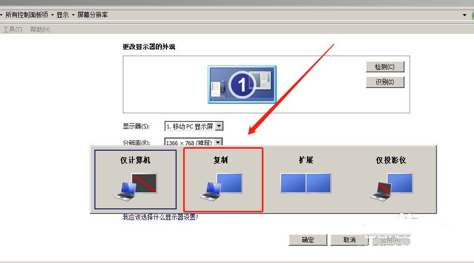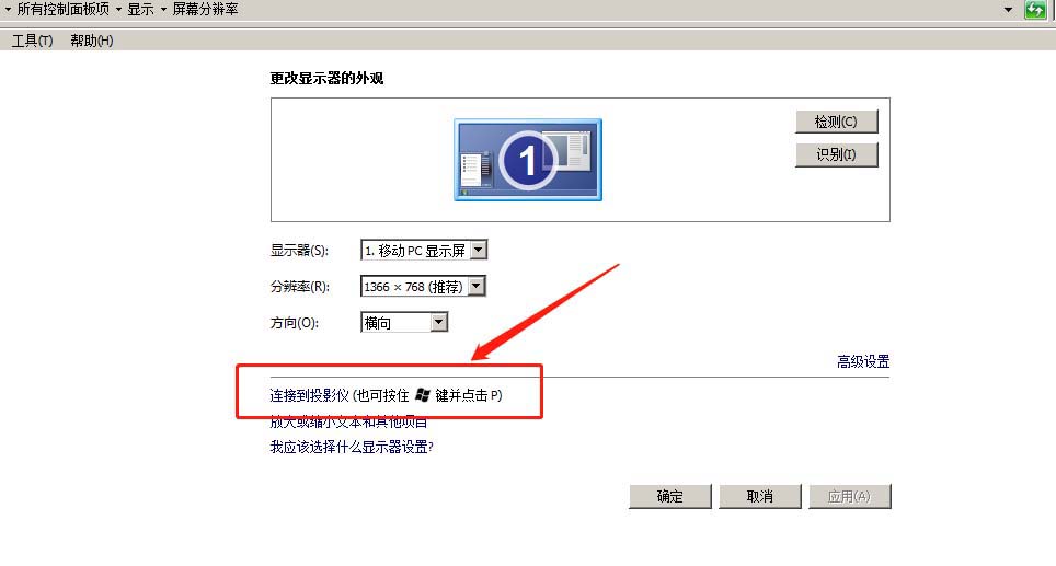 4、電腦開機(jī)后,然后按鍵盤上的Fn+F5/F4,自己搜索具體信號(hào)電腦的快捷鍵,快捷鍵進(jìn)行投影。也可以打開電腦桌面,右鍵桌面,選擇屏幕分辨率,然后選擇連接到投影儀,再選擇復(fù)制即可。如圖所示: