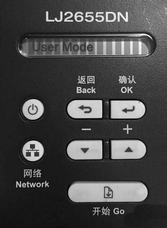 4、打開打印機前蓋,同時按住“關機”和“開始”兩鍵,會出現帶陰影的Users Mode 的字樣。
