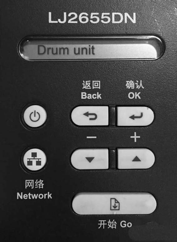 1、開機狀態下打開前蓋;按住“確認”鍵直到屏幕出現“Drum unit”,松手;